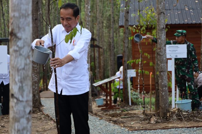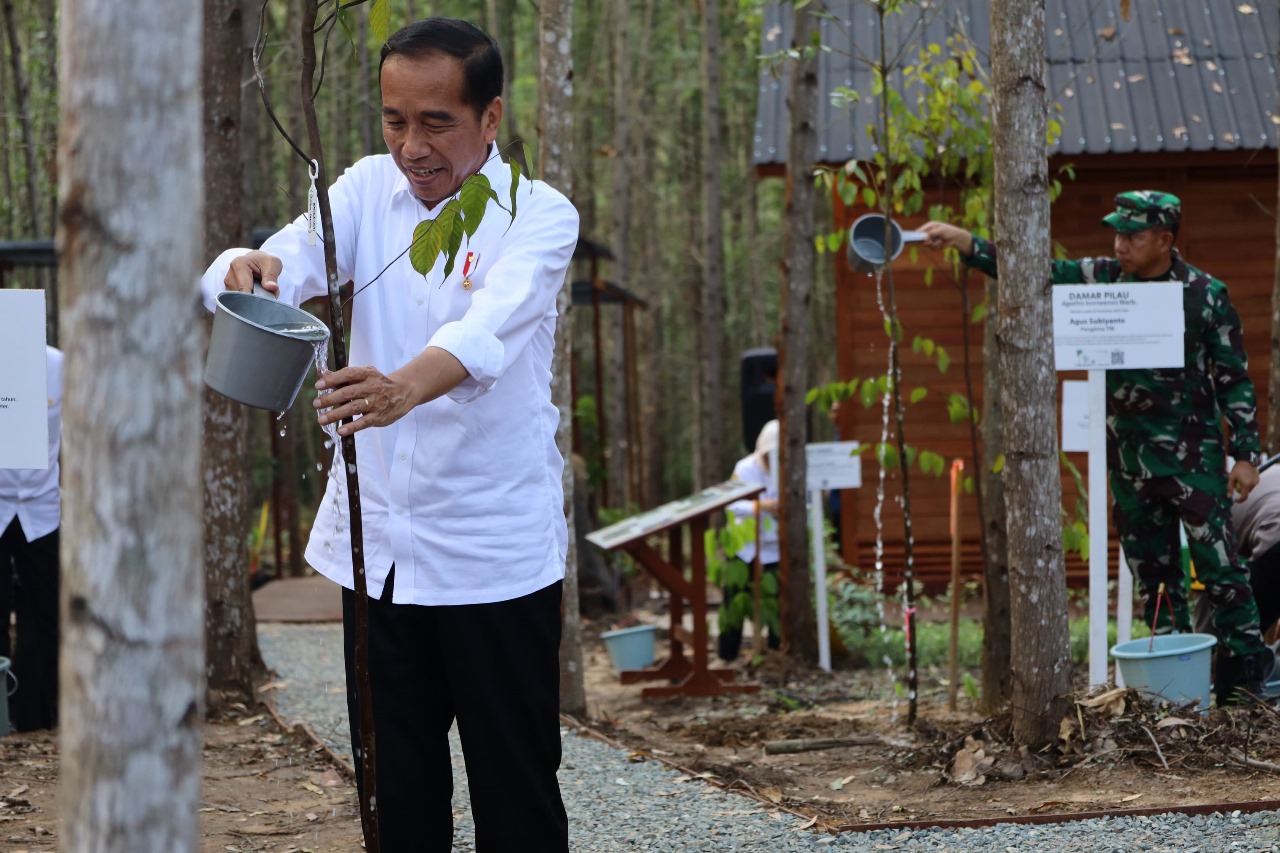 Pada Rabu (20/12/2023), Presiden Joko Widodo melakukan penanaman dan peninjauan lokasi Miniatur Hutan Hutan Tropis Nusantara. Tampak mendampingi Presiden, Menteri Lingkungan Hidup dan Kehutanan (LHK) Siti Nurbaya, Kepala Otorita IKN Bambang Susantono, dan Pj. Gubernur Kalimantan Timur Akmal Malik. Dalam kegiatan ini hadir pula CEO dari ketiga perusahaan mitra serta Rektor Universitas Mulawarman Abdunnur.